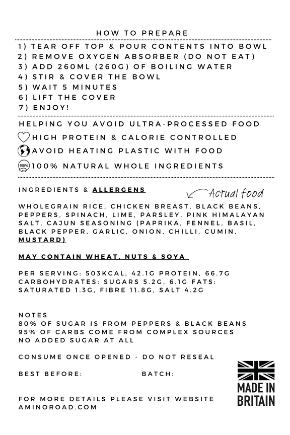 Ingredients: Wholegrain rice, chicken breast, black beans, peppers, spinach, lime, parsley, pink himalayan salt, cajun seasoning (paprika, fennel, basil, black pepper, garlic, onion, chilli, cumin, mustard).