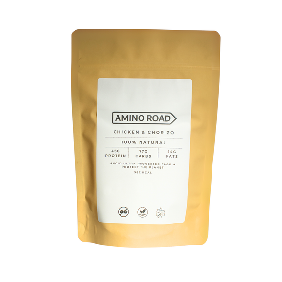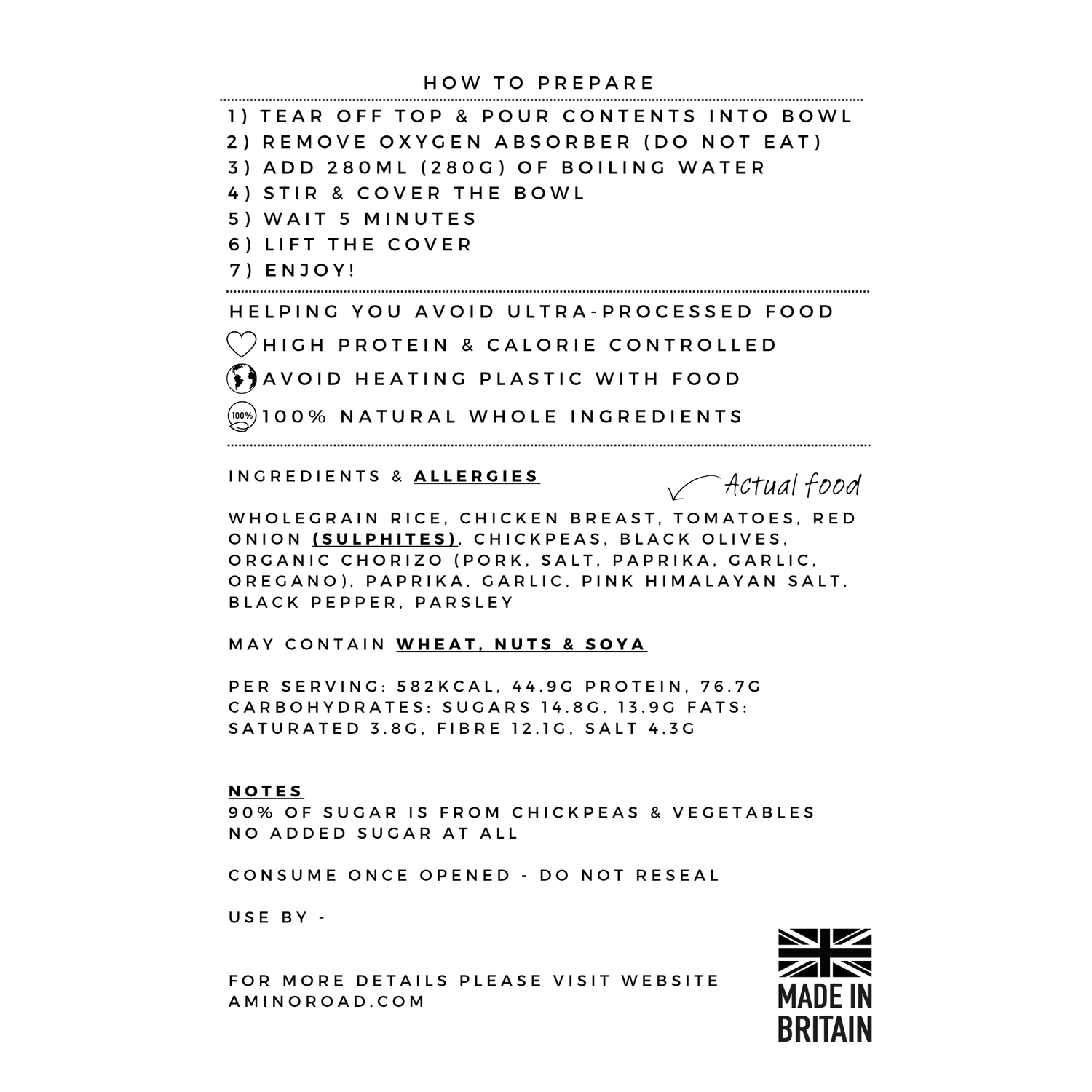 Ingredients: Wholegrain rice, chicken breast, tomatoes, red onion (sulphites), chickpeas, black olives, organic chorizo (pork, salt, paprika, garlic, oregano), paprika, garlic, pink himalayan salt, black pepper, parsley.