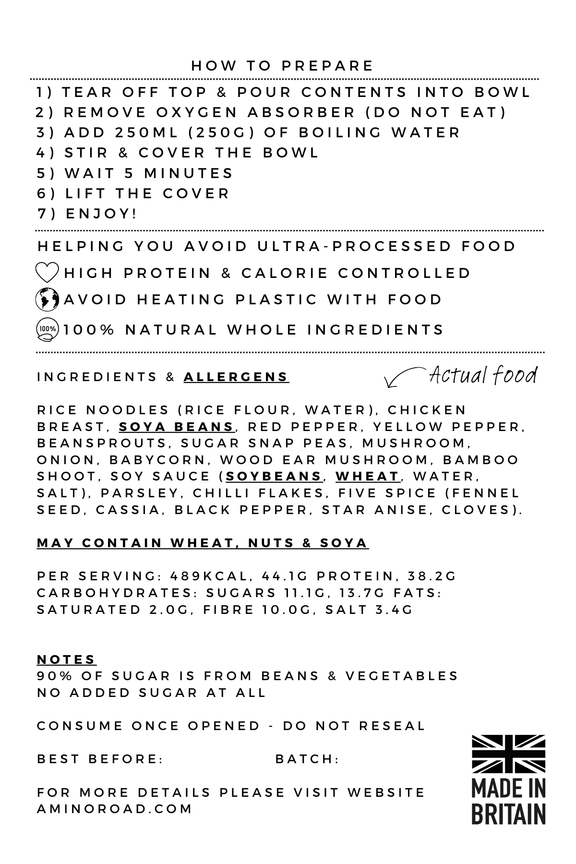 Ingredients: Rice Noodles (Rice Flour, Water), Chicken Breast, Edamame (Soya Beans), Red Pepper, Yellow Pepper, Beansprouts, Sugar Snap Peas, Mushroom, Onion, Babycorn, Wood Ear Mushroom, Bamboo Shoot, Soy Sauce (Soybeans, Wheat, Water, Salt), Parsley, Chilli Flakes, Five Spice (Fennel Seed, Cassia, Black Pepper, Star Anise, Cloves).